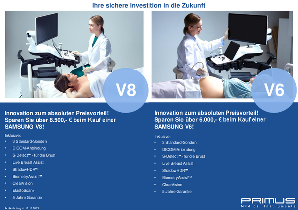 Von Oktober bis Mitte Dezember erhalten Sie bei uns exklusive Rabatte auf alle gynäkologischen Samsung V6 und V8 Ultraschallsysteme, ausgestattet mit innovativsten Softwarefeatures, inklusive 5 Jahre rundum-sorglos Garantie.