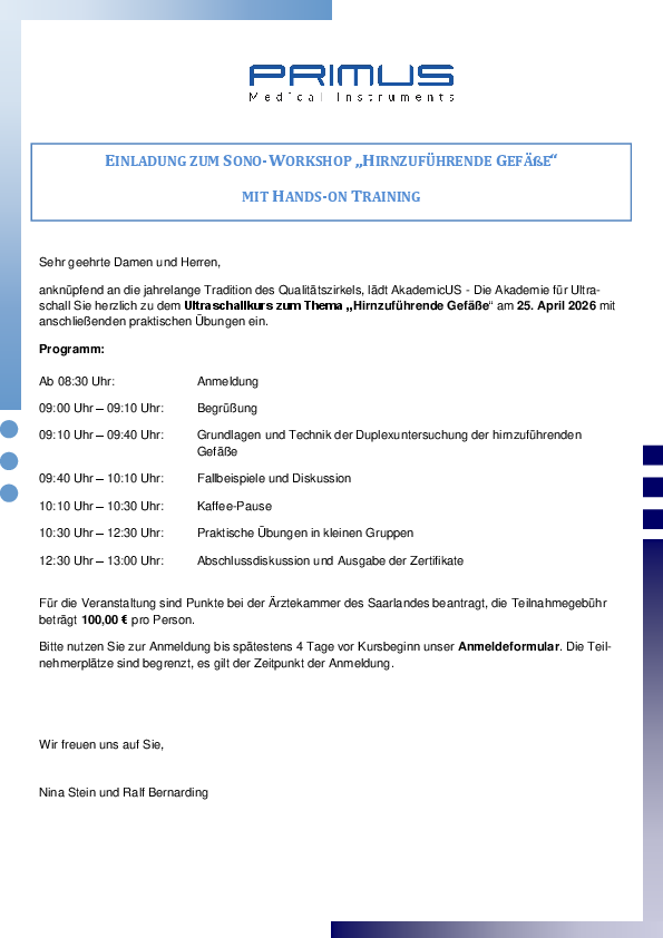 Anknüpfend an die jahrelange Tradition des Qualitätszirkels, lädt AkademicUS - Die Akademie für Ultraschall Sie herzlich zu dem Ultraschallkurs zum Thema „Hirnzuführende Gefäße“ am 25. April 2026 mit anschließenden praktischen Übungen ein.